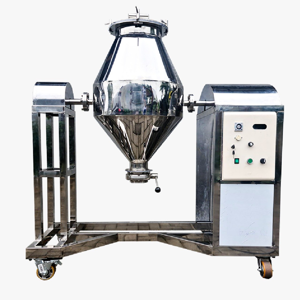 MIxer Double Cone ini mesin pencampur yang terdiri dari dua kerucut yang berputar pada porosnya. Biasa nya mesin ini digunakan  untuk kebutuhan food industri dan pharmacy industri yang berfungsi untuk mencampurkan bahan liquid atau granula. Sehingga bisa tercampur dengan merata.